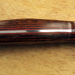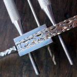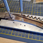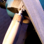 Deux rondelles de bronze sont posées de chaque côté de la lame. Celle-ci est fixée dans l’ensemble sertie, serrée et contrôlée.