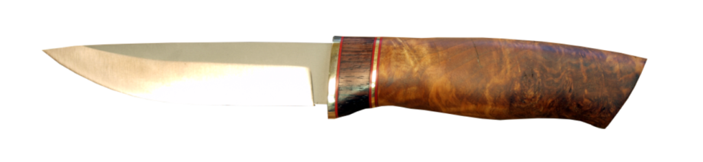 – Lames inox, carbone ou damas, habillage en divers bois et loupes de bois stabilisés au « cactus juice ».